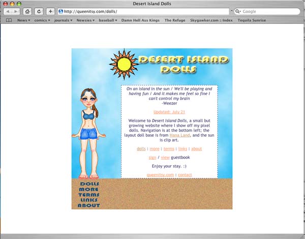 This site was opened July 21, 2005, as a place for me to dump... I mean showcase... my pixel dolls. I originally was going to name the site "Island in the Sun Dolls" after the Weezer song that was stuck in my head, but I liked the alliteration of Desert Island Dolls better. I got an idea for the layout even though I didn't have many dolls, decided to go ahead with it. (screencap of the original layout)